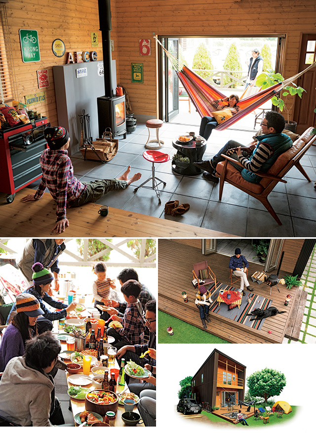 土間リビングでパーティーしたり、デッキで寛いだり、薪ストーブを囲んで語り合ったり…。
