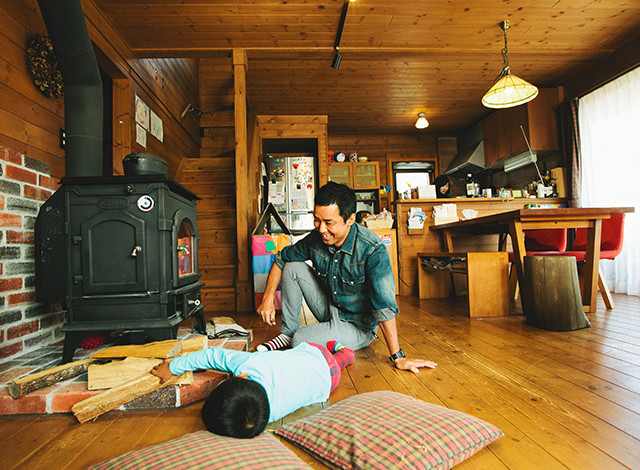 子供ができたことを機に、カントリーログハウスを契約。もちろん念願の薪ストーブも導入した。「自分が欲しかった薪ストーブですが、今では子供たちと一緒に火のある暮らしを楽しんでいます。普通の家には薪ストーブなんてありませんし、火に触れることもほとんどないと思います。暖を取る道具としての機能はもちろん、ピザをつくったり、料理をしたりといった楽しみができるのもBESSだからこそなんだと思います」。