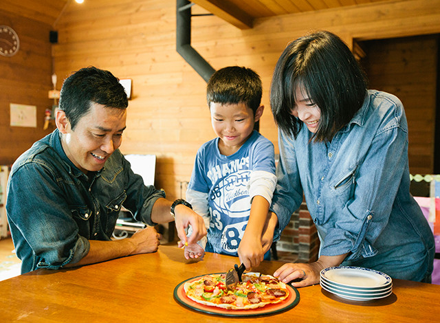 ピザのトッピングはお兄ちゃんの役割。こんがりサクッと焼けたピザに家族みんなが集合。「火を使って料理をする。毎日のようにそんな体験ができるのはログハウスだからこそ」。