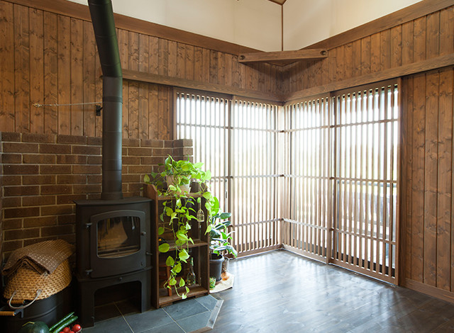 「炎のゆらめきを見ているだけで心地よく、落ち着くんです」という薪ストーブは居住スペースを考慮した配置。「薪は少しずつ集め、冬に備えています」とAさん。