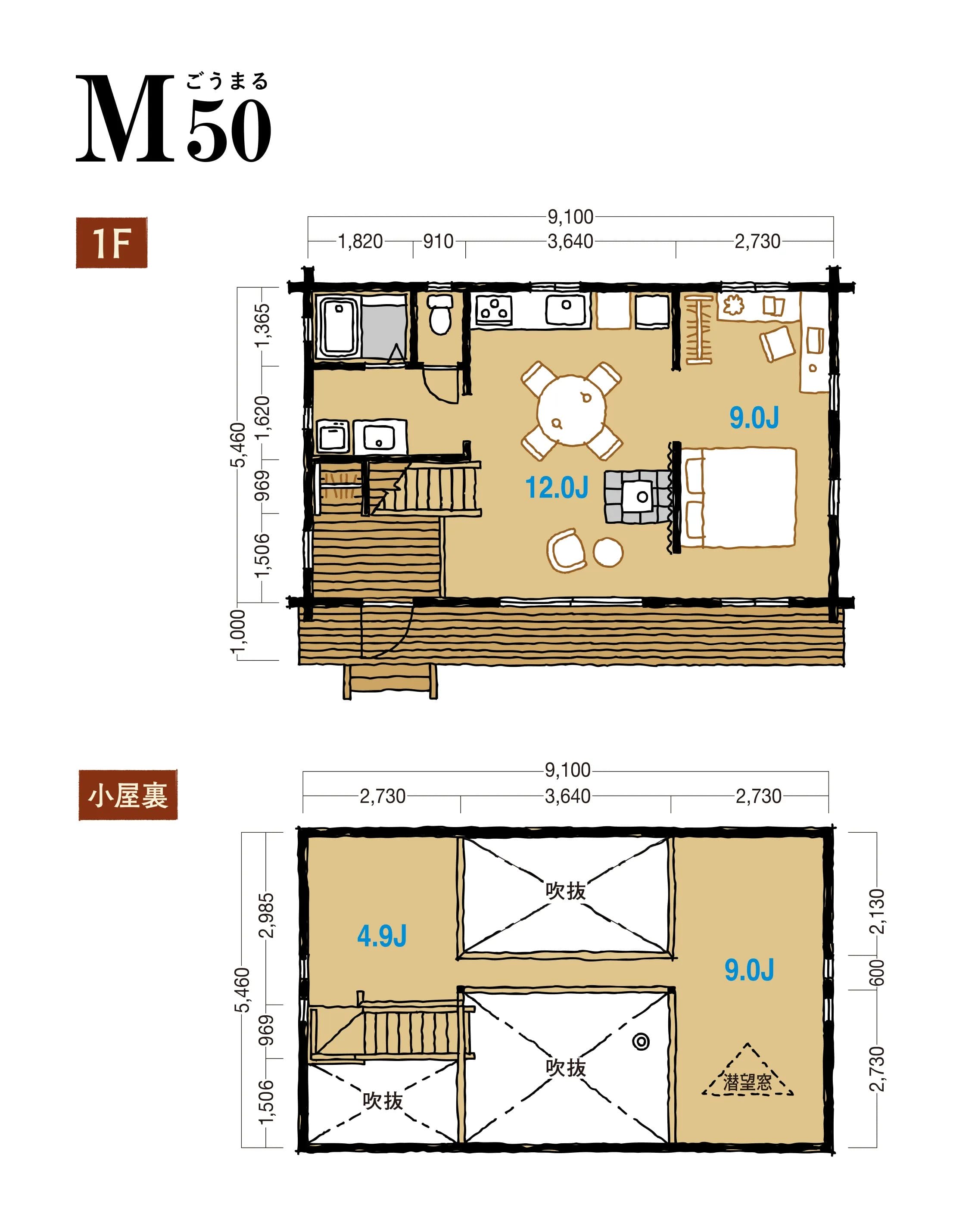 ログ壁が身近で外とのつながりを楽しめる、ひと続きの小屋空間。