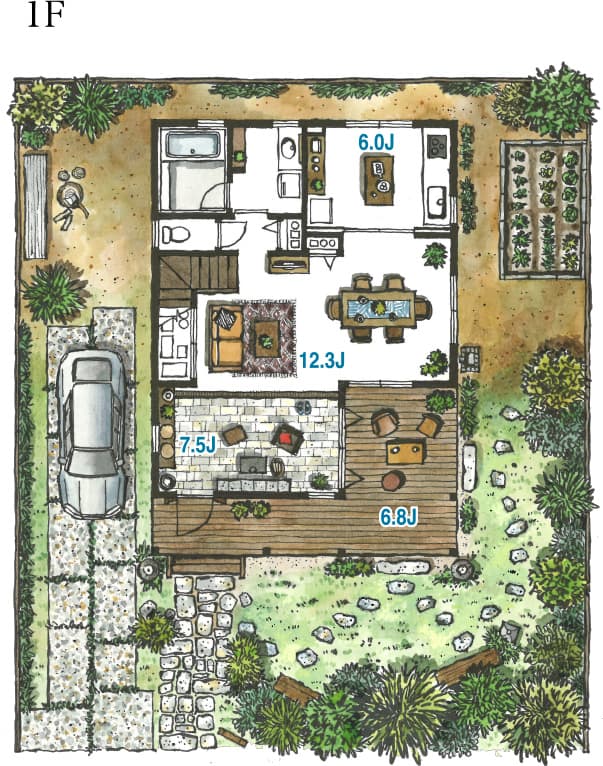 内と外の縁をとりもつ開放空間。そこは外のようでもあり内のようでもある。自然の移ろいを肌で感じ、家族や来客と寛げる。